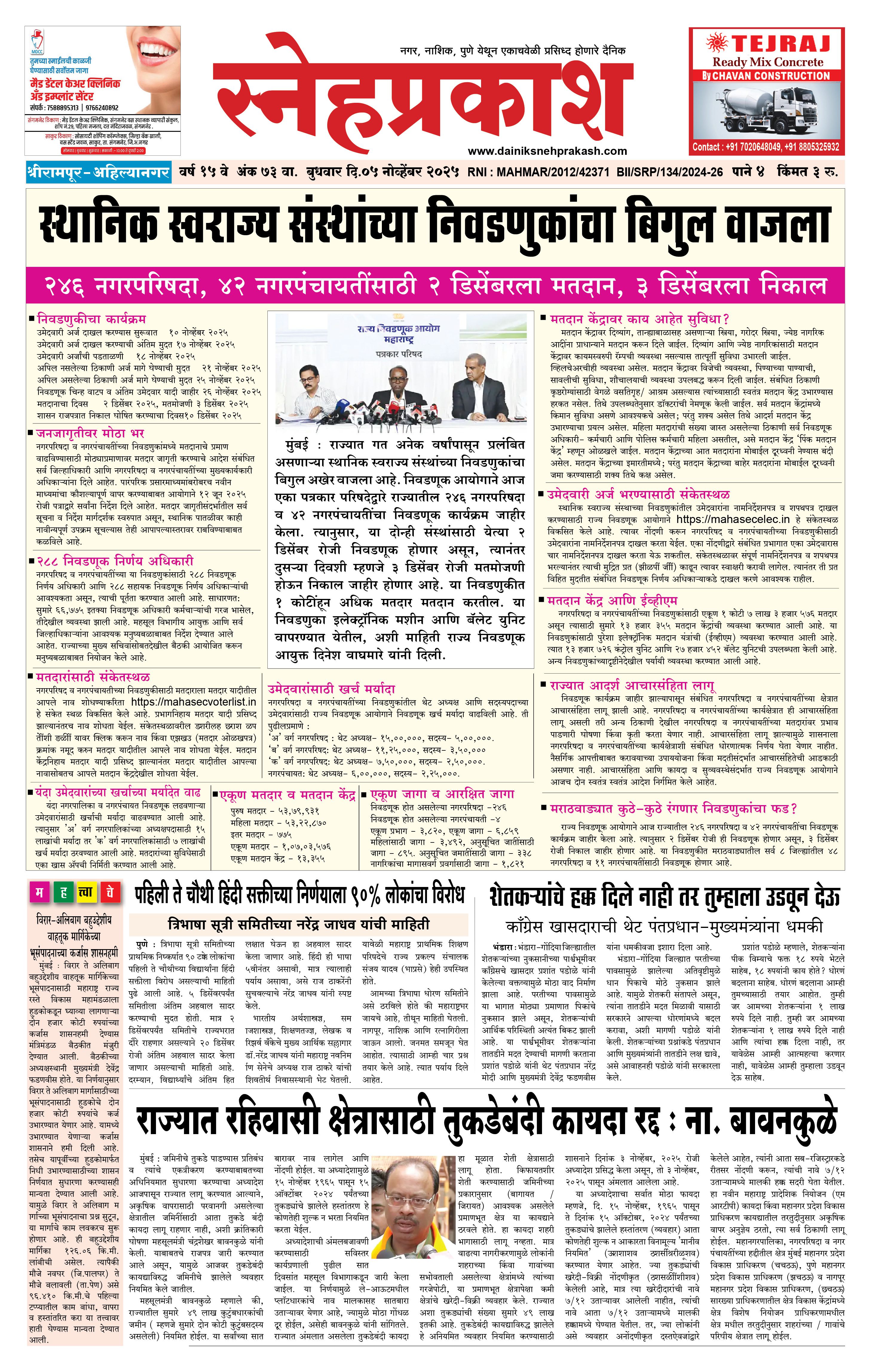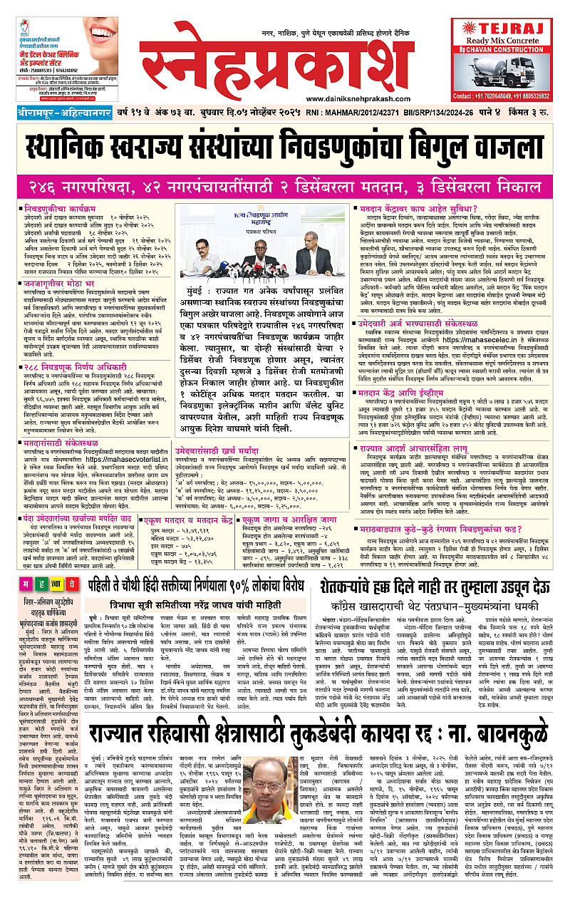 Daily Snehprakash (Marathi) November 05, 2025 Ahilyanagar-Pune-Nashik-shrirampur maharashtra 1 2 3 4 Page 1Page 2Page 3Page 4 × Daily Snehprakash (Marathi) 1-4 colour1-4 colour21-4 colour31-4 colour4 << First << 1 >> Last >> Page no 1Page no 2Page no 3Page no 4