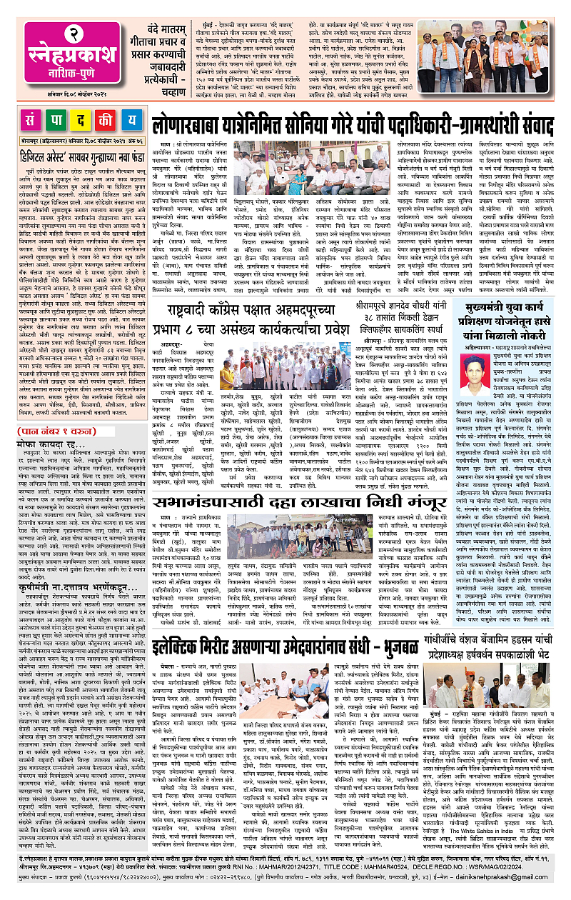 Daily Snehprakash (Marathi) Page: 2 November 08, 2025 Ahilyanagar-Pune-Nashik-shrirampur maharashtra 1 2 3 4 Page 1Page 2Page 3Page 4 × Daily Snehprakash (Marathi) 1-4 colour1-4 colour21-4 colour31-4 colour4 << First << 2 >> Last >> Page no 1Page no 2Page no 3Page no 4