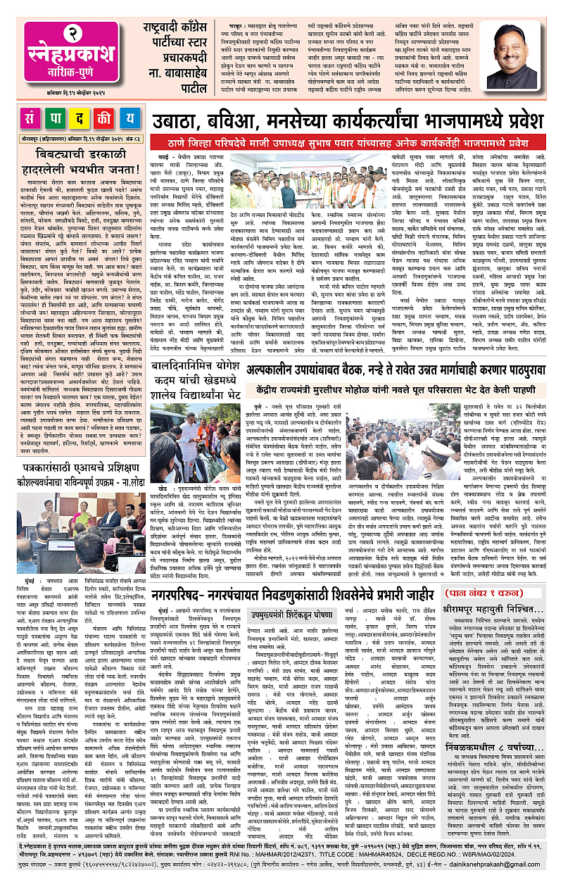 Daily Snehprakash (Marathi) Page: 2 November 15, 2025 Ahilyanagar-Pune-Nashik-shrirampur maharashtra 1 2 3 4 Page 1Page 2Page 3Page 4 × Daily Snehprakash (Marathi) 1-41-421-431-44 << First << 2 >> Last >> Page no 1Page no 2Page no 3Page no 4