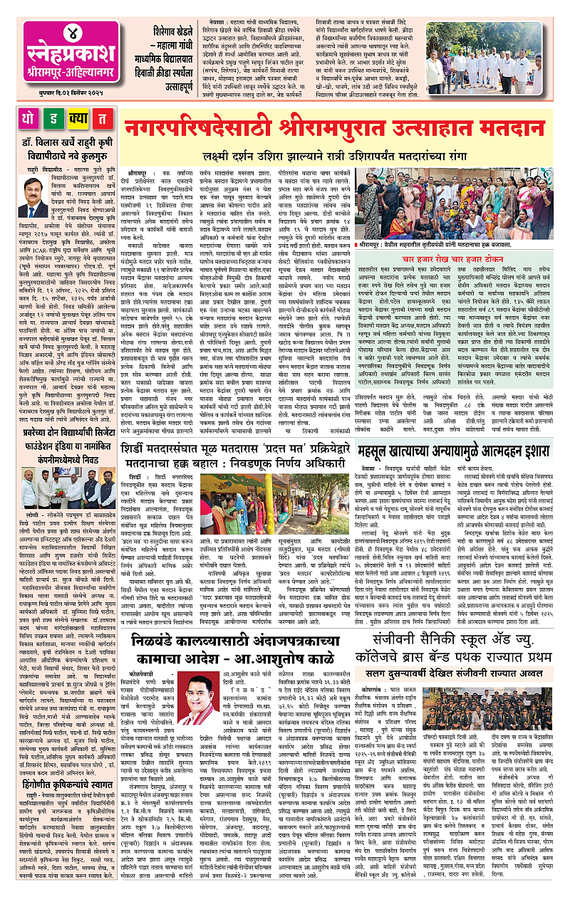 Daily Snehprakash (Marathi) Page: 4 December 03, 2025 ahilyanagar-pune-nashik-shrirampur-maharashtra 1 2 3 4 Page 1Page 2Page 3Page 4 × Daily Snehprakash (Marathi) 4424344 << First << 4 >> Last >> Page no 1Page no 2Page no 3Page no 4