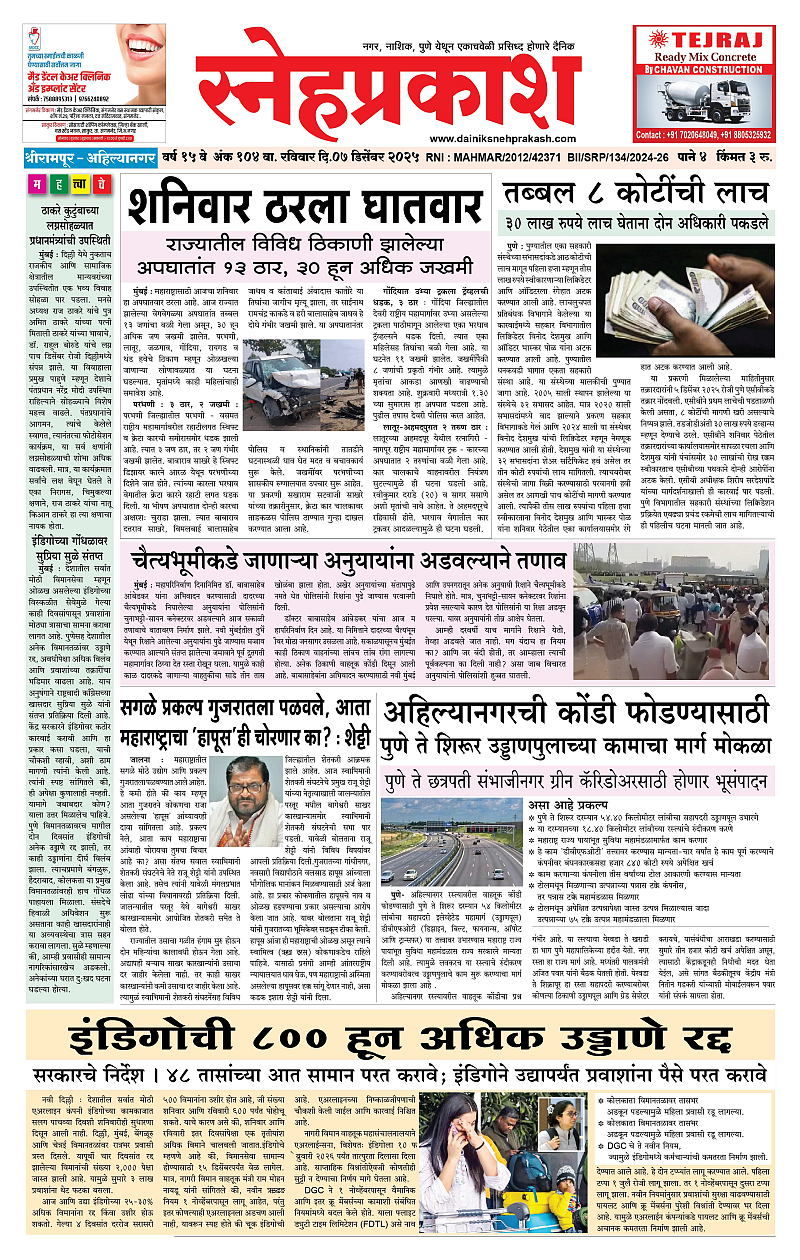 Daily Snehprakash (Marathi) December 07, 2025 ahilyanagar-pune-nashik-shrirampur-maharashtra 1 2 3 4 Page 1Page 2Page 3Page 4 × Daily Snehprakash (Marathi) 1121314 << First << 1 >> Last >> Page no 1Page no 2Page no 3Page no 4