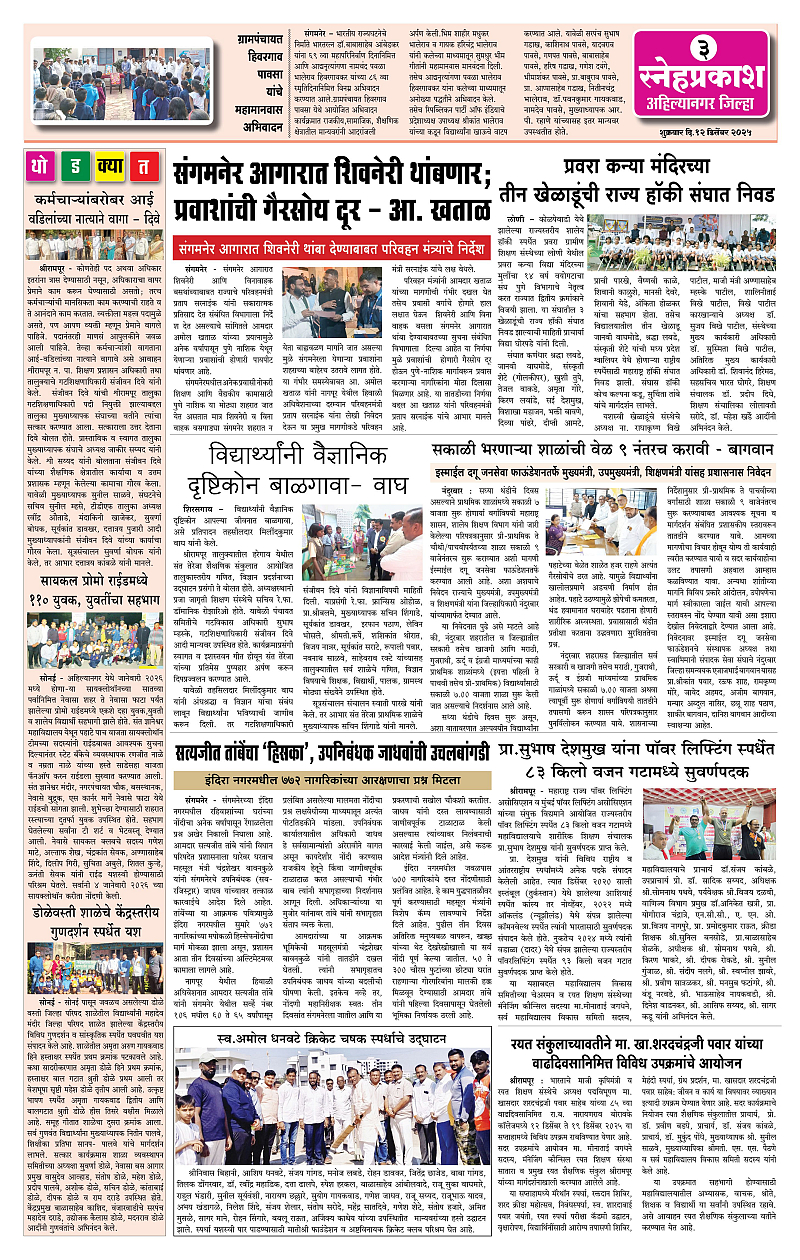 Daily Snehprakash (Marathi) Page: 3 December 12, 2025 Ahilyanagar-Pune-Nashik-shrirampur maharashtra 1 2 3 4 Page 1Page 2Page 3Page 4 × Daily Snehprakash (Marathi) 1121314 << First << 3 >> Last >> Page no 1Page no 2Page no 3Page no 4