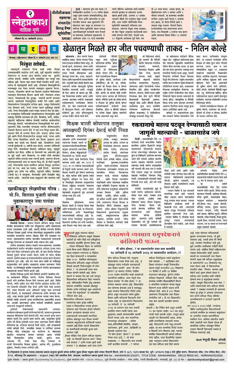 Daily Snehprakash (Marathi) Page: 2 January 18, 2026 Ahilyanagar-Pune-Nashik-shrirampur maharashtra 1 2 3 4 Page 1Page 2Page 3Page 4 × Daily Snehprakash (Marathi) 1-41-421-431-44 << First << 2 >> Last >> Page no 1Page no 2Page no 3Page no 4