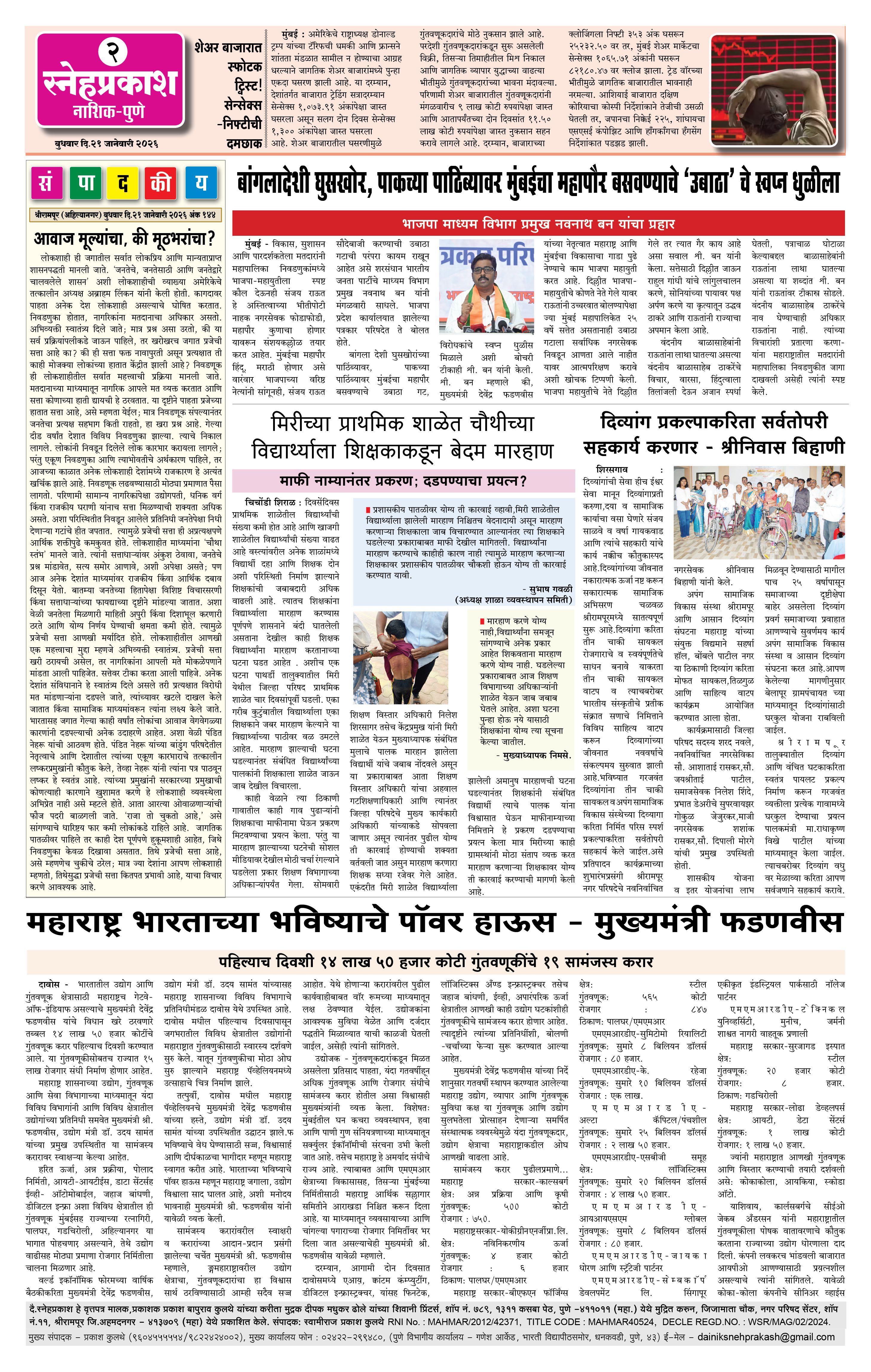 Daily Snehprakash (Marathi) Page: 2 January 21, 2026 Ahilyanagar-Pune-Nashik-shrirampur maharashtra 1 2 3 4 Page 1Page 2Page 3Page 4 × Daily Snehprakash (Marathi) 1-41-421-431-44 << First << 2 >> Last >> Page no 1Page no 2Page no 3Page no 4