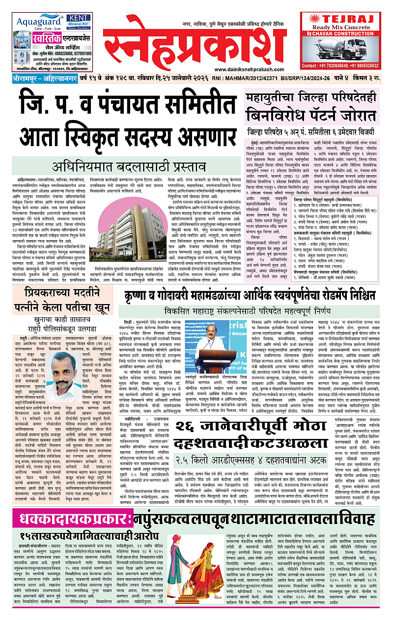Daily Snehprakash (Marathi) January 25, 2026 Ahilyanagar-Pune-Nashik-shrirampur maharashtra 1 2 3 4 Page 1Page 2Page 3Page 4 × Daily Snehprakash (Marathi) 4424344 << First << 1 >> Last >> Page no 1Page no 2Page no 3Page no 4