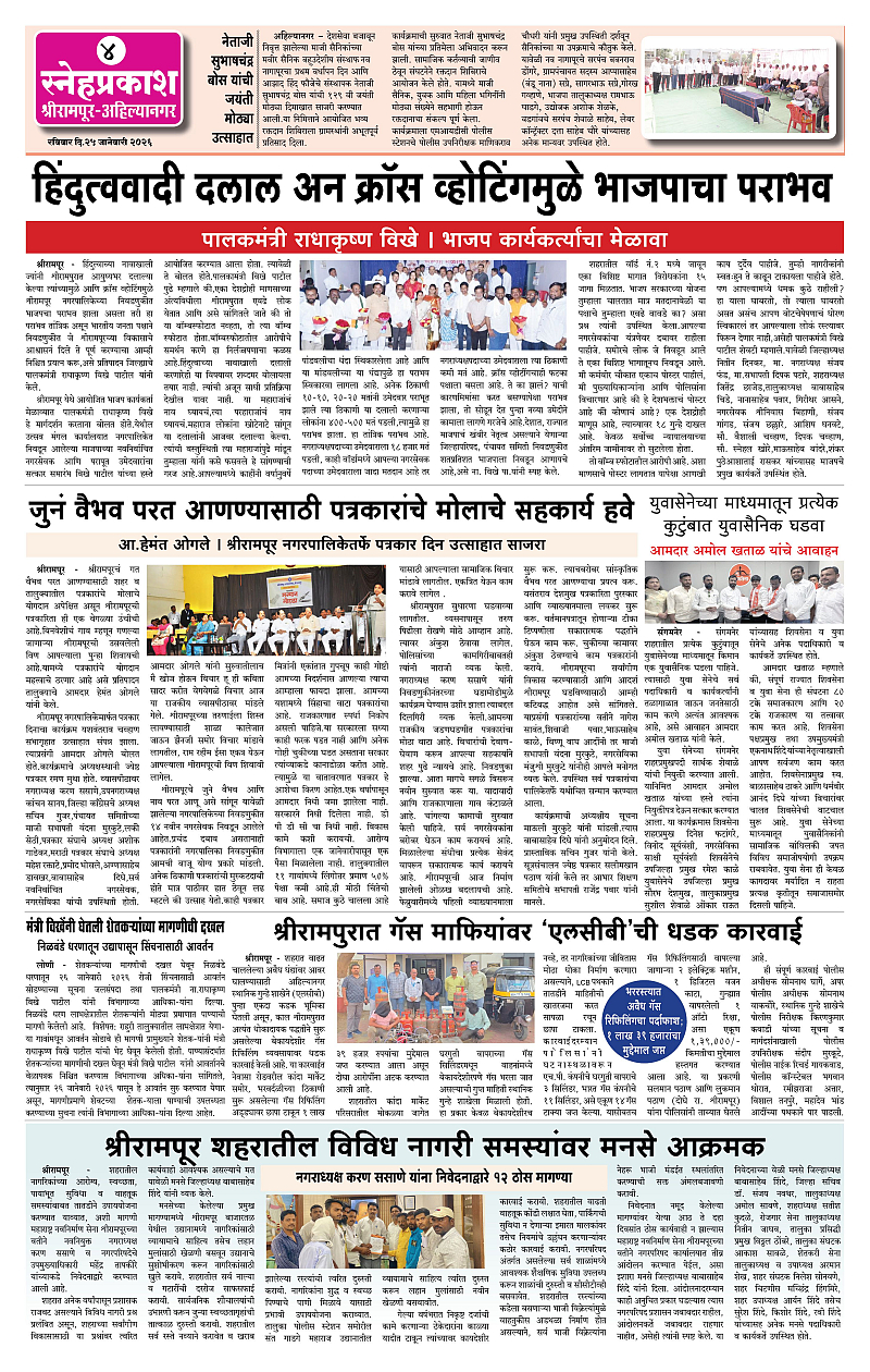 Daily Snehprakash (Marathi) Page: 4 January 25, 2026 Ahilyanagar-Pune-Nashik-shrirampur maharashtra 1 2 3 4 Page 1Page 2Page 3Page 4 × Daily Snehprakash (Marathi) 4424344 << First << 4 >> Last >> Page no 1Page no 2Page no 3Page no 4