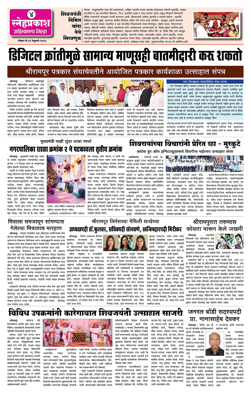 Daily Snehprakash (Marathi) Page: 4 February 22, 2026 Ahilyanagar-Pune-Nashik-shrirampur maharashtra 1 2 3 4 Page 1Page 2Page 3Page 4 × Daily Snehprakash (Marathi) 12-42-422-43 << First << 4 >> Last >> Page no 1Page no 2Page no 3Page no 4
