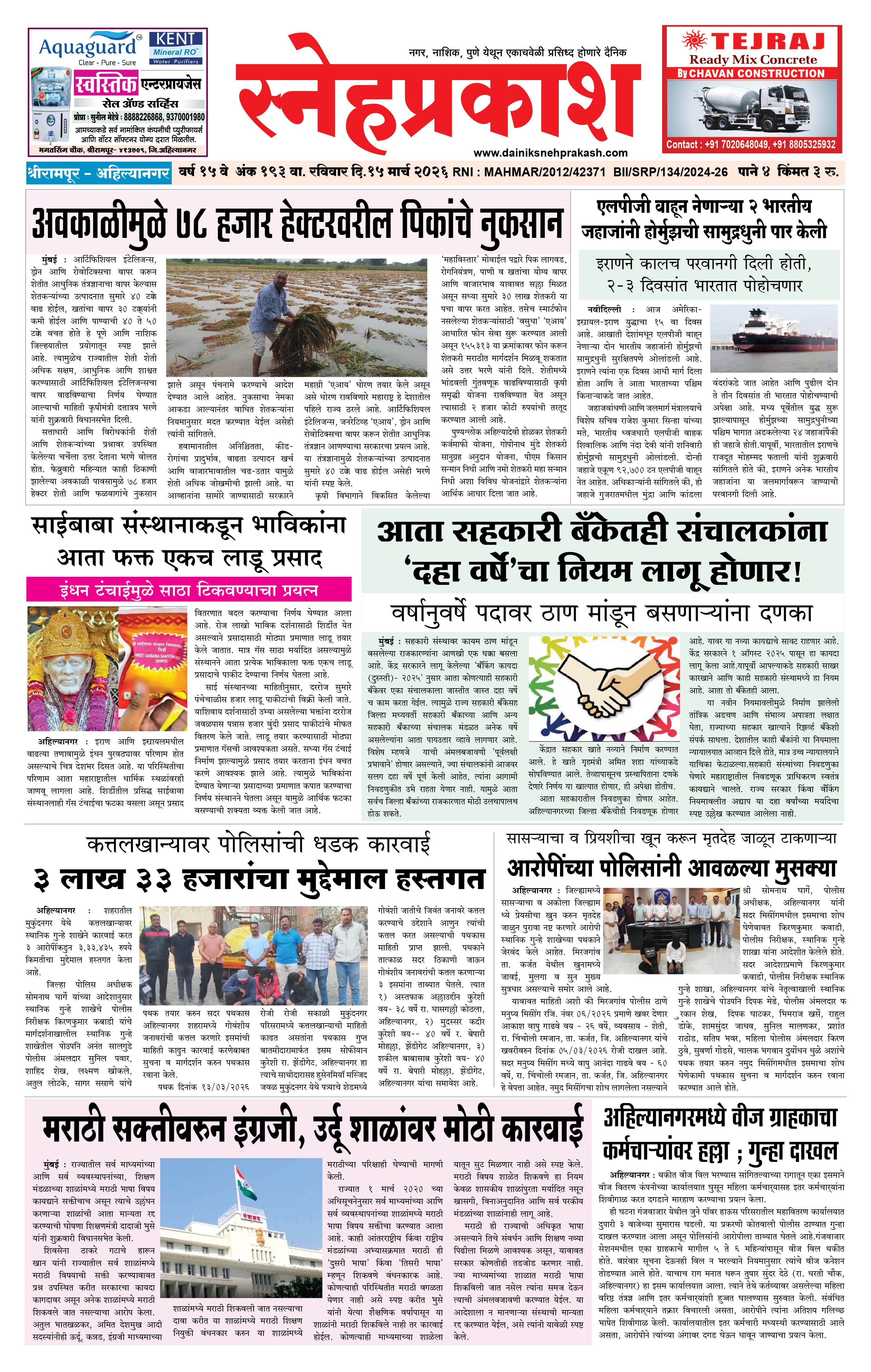 Daily Snehprakash (Marathi) March 15, 2026 Ahilyanagar-Pune-Nashik-shrirampur maharashtra 1 2 3 4 Page 1Page 2Page 3Page 4 × Daily Snehprakash (Marathi) 1-41-421-431-44 << First << 1 >> Last >> Page no 1Page no 2Page no 3Page no 4