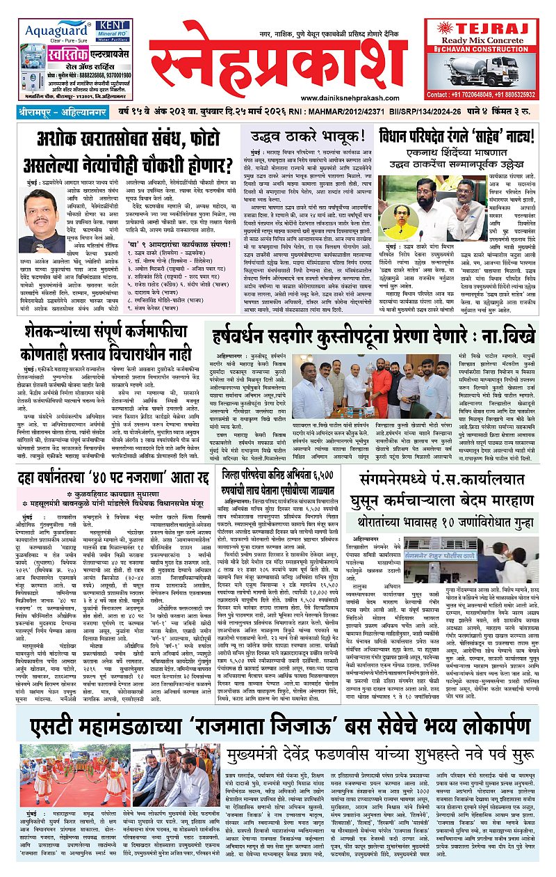 Daily Snehprakash (Marathi) March 25, 2026 Ahilyanagar-Pune-Nashik-shrirampur maharashtra 1 2 3 4 Page 1Page 2Page 3Page 4 × Daily Snehprakash (Marathi) 1-41-421-431-44 << First << 1 >> Last >> Page no 1Page no 2Page no 3Page no 4